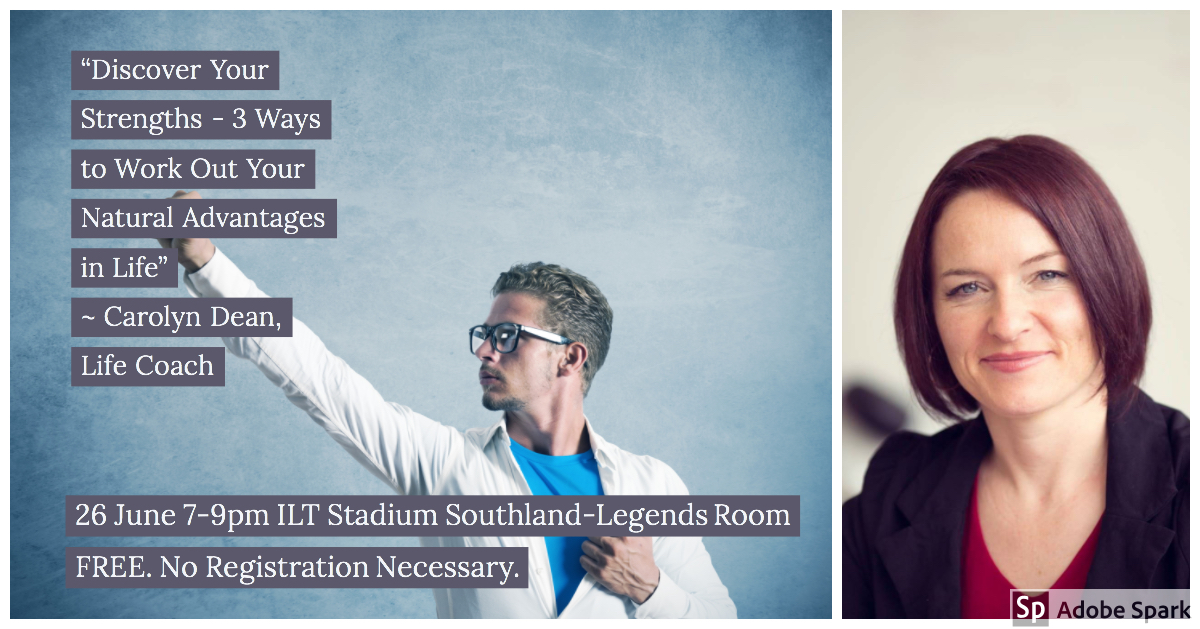 Next month our talk is on June 26 at 7pm at ILT Stadium Southland by life coach, Carolyn Dean, on "Discover Your Strengths - 3 Ways to Work Out Your Natural Advantages in Life" Find out more about Carolyn here: http://www.carolyndeancoaching.com